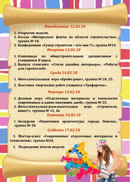 1. Интеллектуально-развлекательная игра «Строители, виват!», группы № 15, 16, победила команда группы №16, победители были поощрены.