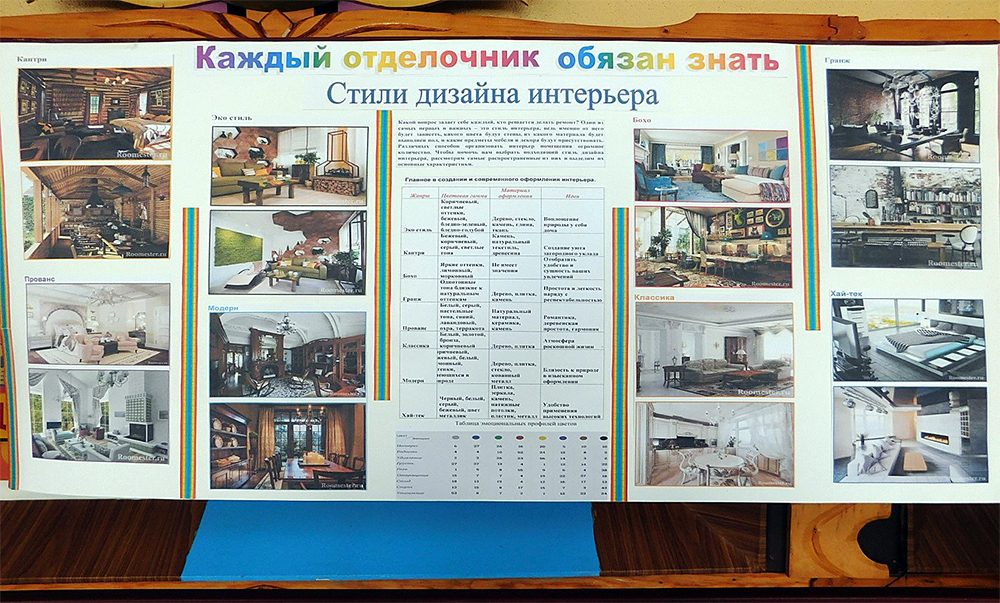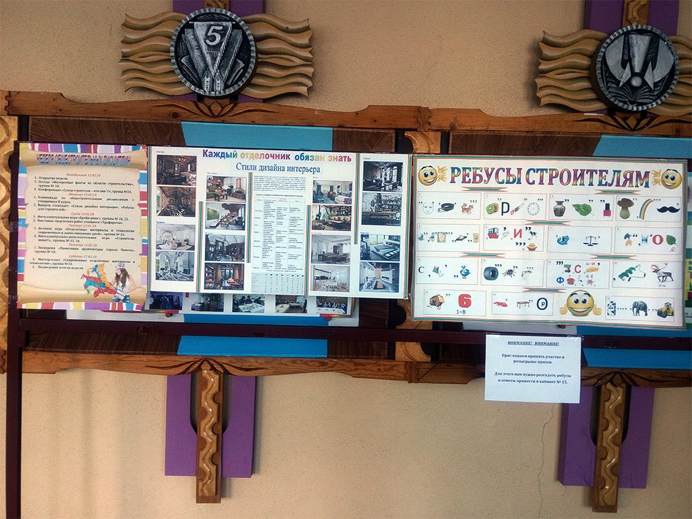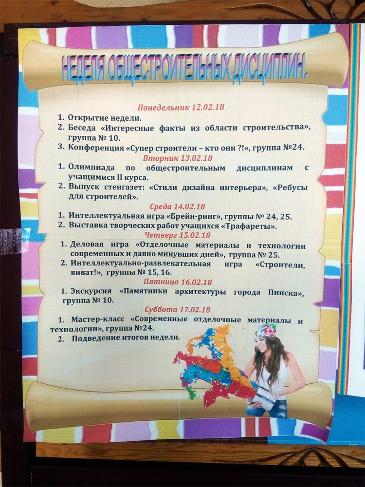1. Выпуск стенгазет: «Стили дизайна интерьера», «Ребусы для строителей», первых 10 учащихся правильно решивших ребусы награждены «9» по спецтехнологии.