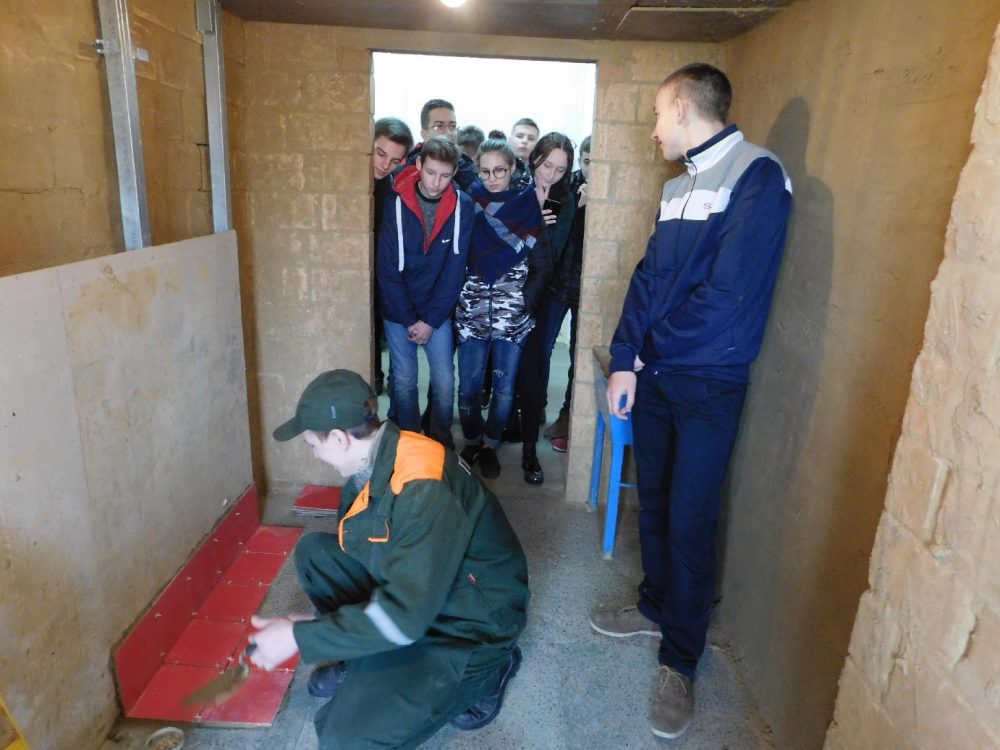 В ходе обзорной экскурсии была продемонстрирована материально-техническая база, обеспечивающая «выдачу» всех профессий. Была проведена профессиональная проба «Нанесения штукатурки», «Контактная сварка».
